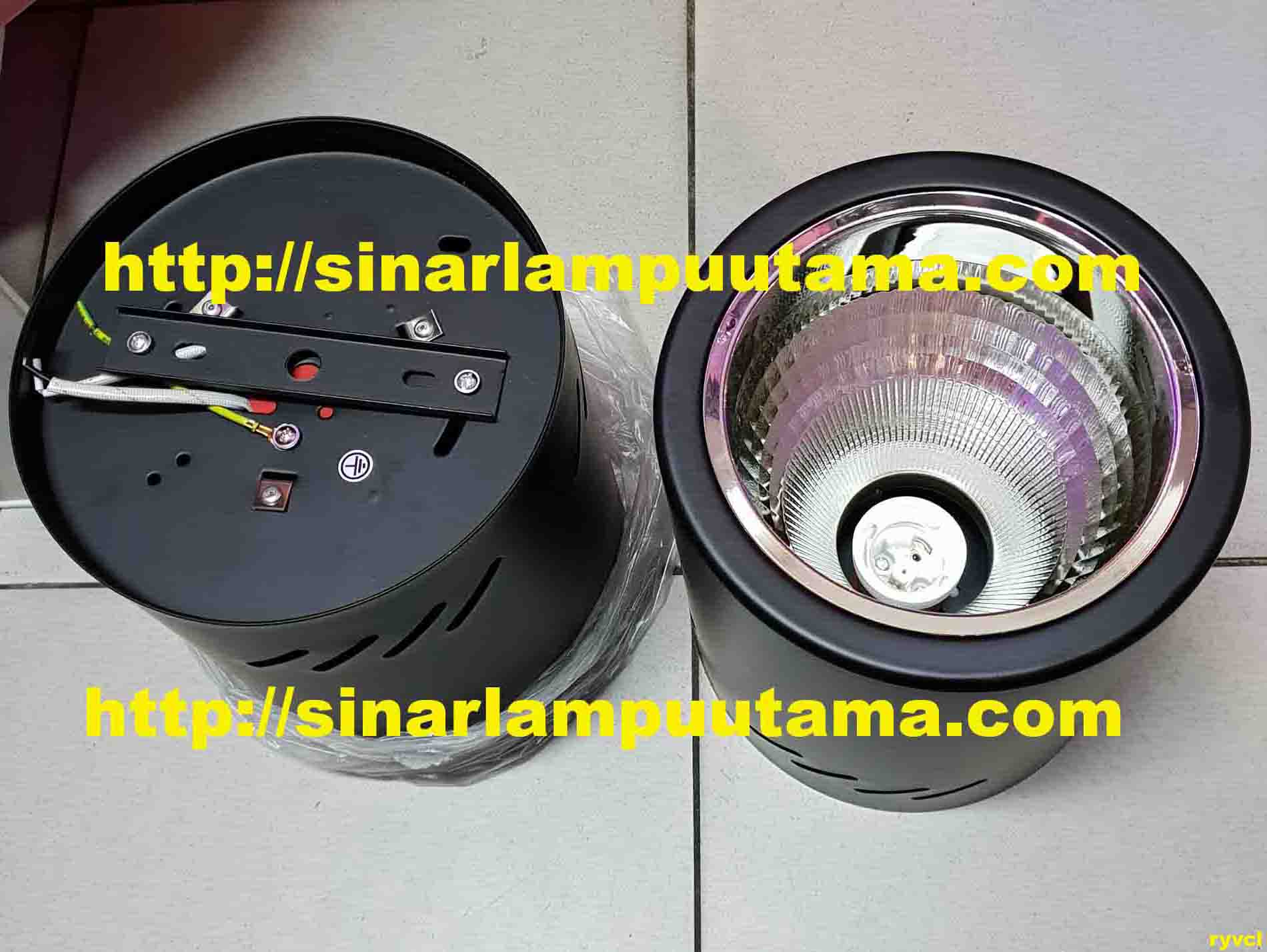Downlight Outbow 5 inch Bulat Fitting E27 untuk rumah atau bangunan tinggi, pada gedung perkantoran, pusat perdagangan, rumah mewah, restaurant, cafe, dll, model downlight outbow ( di luar plafon ) bentuk bulat 5 inch warna hitam fitting E27 untuk lampu hemat energy ( LHE ) atau lampu Led bulb bohlam ukuran besar atau untuk lampu sorot PAR30 35watt untuk plafon tinggi 8 – 10 meter, tambahan reflector dalam downlight kilap yang membantu pantulan cahaya lebih terang, model yang elegant, dan mewah, kuat dan daya tahan lama