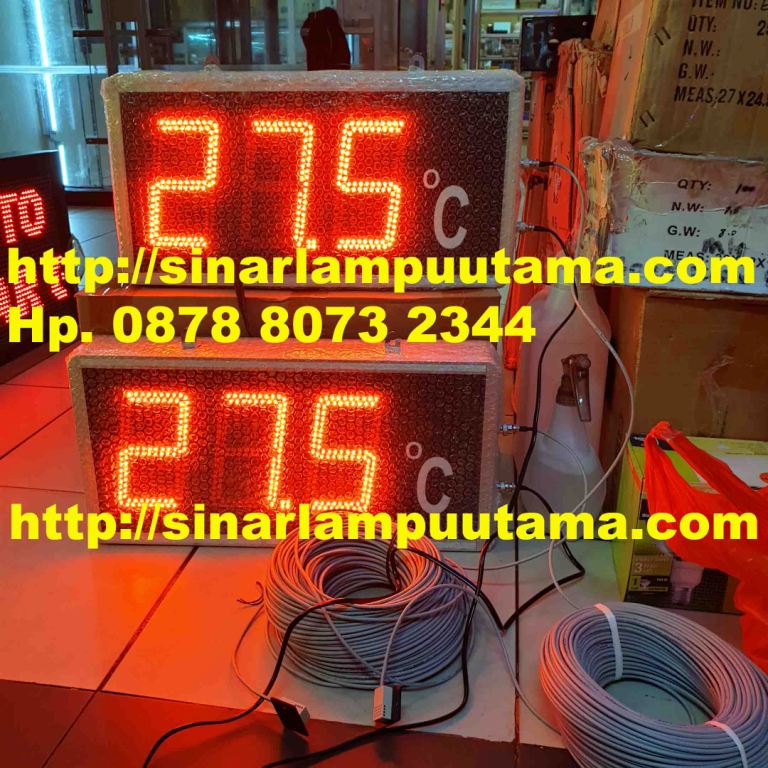 Lampu Display Temperatur Suhu Termometer Suhu untuk mengukur suhu udara sebuah ruangan dengan angka lampu display papan lampu ini yang di tampilkan dalam display layar termometer suhu atau papan lampu display digital temperature suhu ini, mengunakan jenis lampu Led merah ukuran 6 inch atau 15cm, 3 digit, dan tanda koma dan tanda derajat celcius yang berfungsi untuk petunjuk informasi kepada orang keadaan suhu sebuah ruangan tertentu dengan di deteksi mengunakan sensor, sangat EYE CATCHING