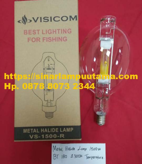 Lampu Metal Halide 1500 Watt Fishing Lamp BT180 color temperature warna 2300K Visicom Best for Fishing lamp untuk kapal nelayan penangkap ikan cumi dan udang daya watt besar 1500 watt bohlam tabung kaca clear, kaki fitting base E40, warna cahaya 2300K, cocok dipakai untuk lampu pemanggil cumi atau ikan dengan cahaya yang sangat terang, sehingga dapat menjangkau ke tempat yang dalam menarik datangnya Ikan dan Cumi agar berkumpul di sekitar terangnya bohlam yang sangat terang ini, untuk di tangkap oleh kapal penangkap Ikan cumi nelayan