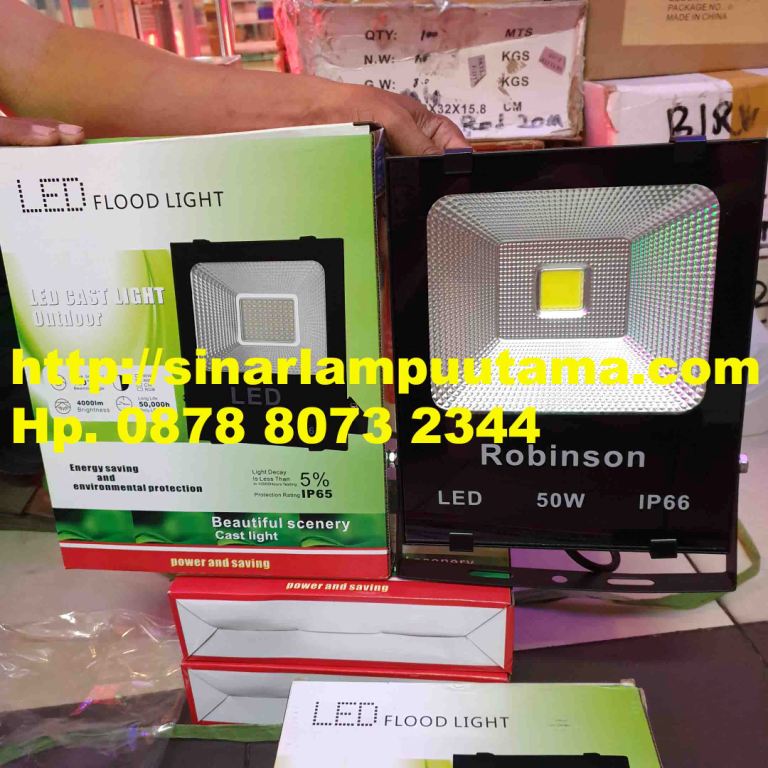 Lampu Sorot LED 50 Watt Robinson COB LED reflector mirror prisma, indeks proteksi IP66 kualitas terbaik merk Robinson, housing dari aluminium cor tebal tahan cuaca hujan dan panas, cocok untuk pemakaian di outdoor dan dengan reflector mirror prisma membantu menghasilkan cahaya yang kuat dan lebih terang dari sinar lampu LED biasa, sangat terang / super bright, daya tahan lama sampai 50.000 jam, kuat dan tahan lama, cocok aplikasi pemakaian untuk lampu sorot lapangan olah raga, lampu sorot lapangan parkir, lampu sorot taman, dll